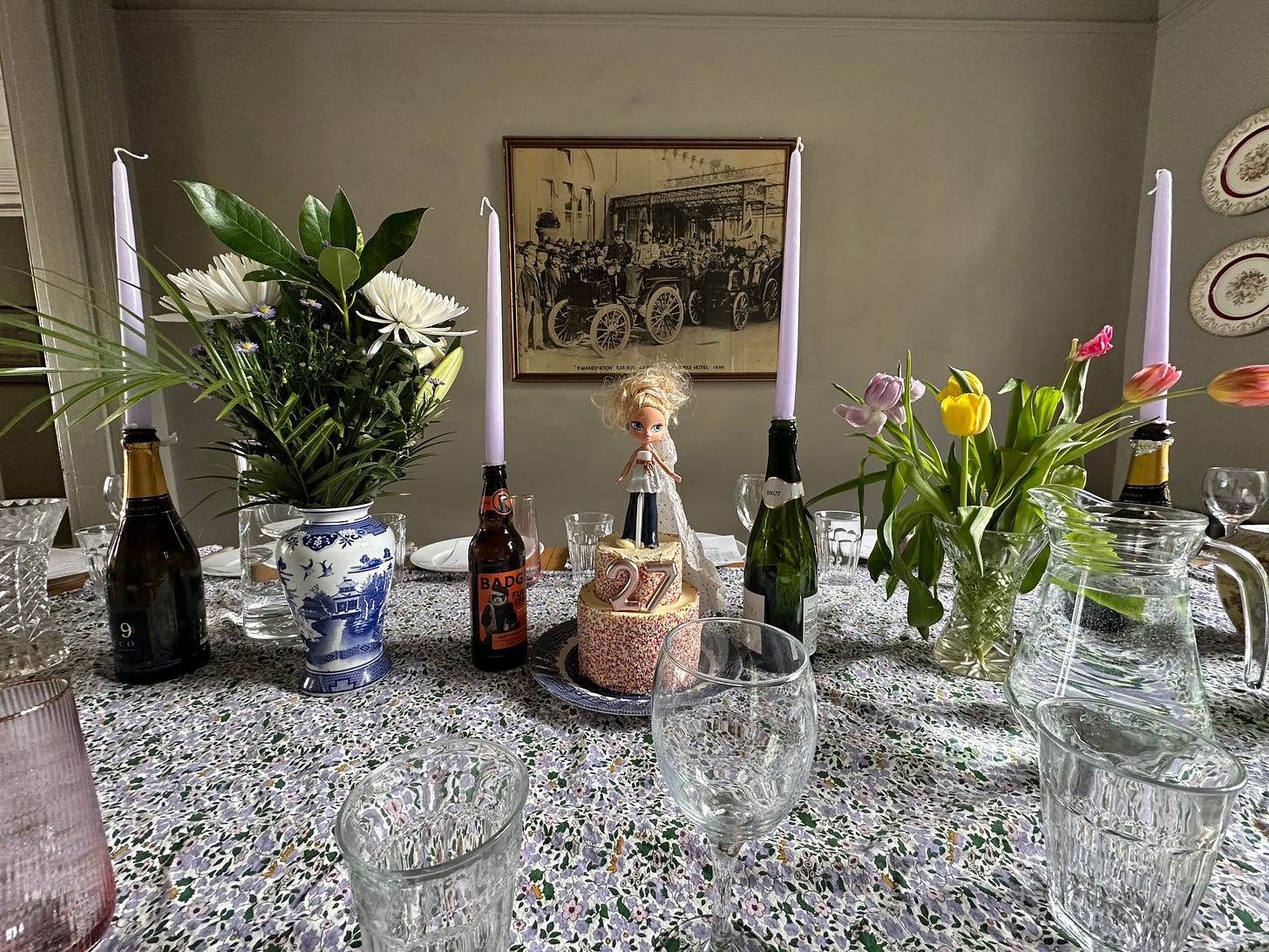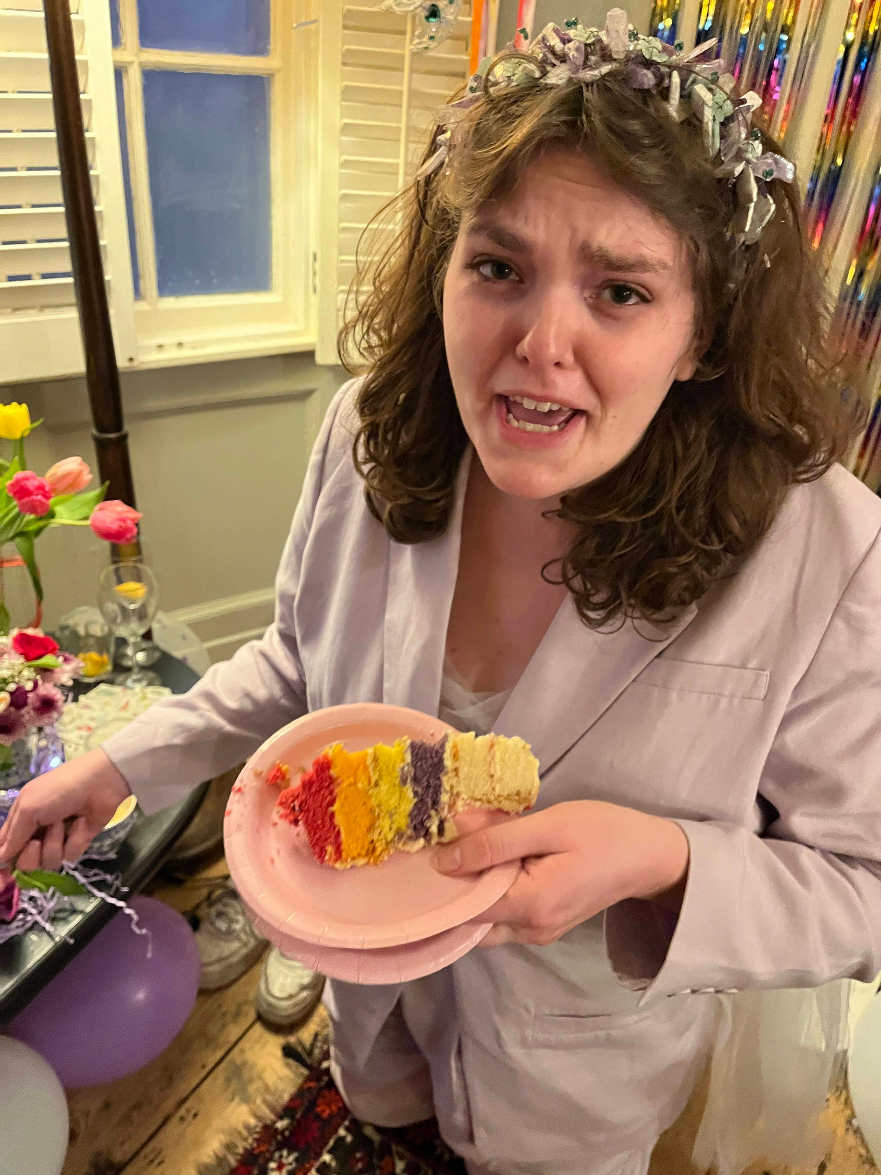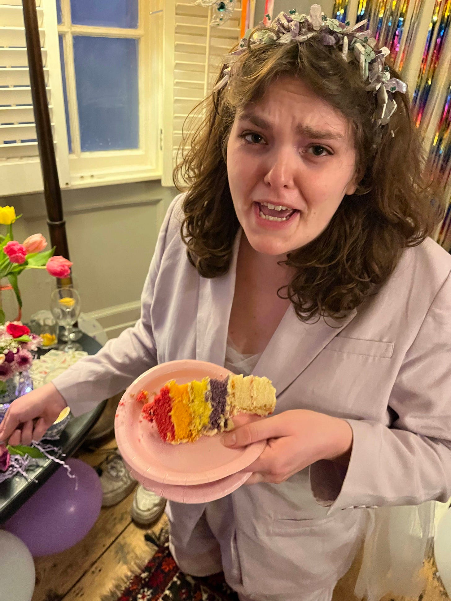 My favorite moment came then, when I looked around and realized my friends had jumped into action. All around me, the people I love were scurrying around making my vision come true. They set the table, prepped the halloumi salad, blew up a LOT of balloons. They took turns as the official wedding photographer. They brought wine and hotcross buns and tea sandwiches and candles and cards. They set up a photobooth and hung lights. They purchased batteries and used bobby pins to open the battery packs of six Peppa Pig walkie talkies that I thought would be funny to have, which, in the end, only emitted a demonic static that made it impossible to understand what anyone was saying. They assembled my wedding cake from two different sized M&S rainbow cakes and a Bratz doll cake topper (I did weep when I cut into the cake during the reception to discover the inside was also rainbow… love is love etc etc). They assembled an aisle out of flowers and lavender tea lights from Poundland (yes, the British equivalent of the dollar store is called Poundland). They went out and bought purple flowers to assemble into bouquets for each of the guests, without me ever asking. Friends who couldn’t make it sent me a playlist for the reception or helped conceive the menu or sent very enthusiastic texts about pictures of me in my bridal outfit.